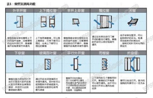 門窗有各種開閉的形式,可以根據房間的用途自由的配置門窗。表1顯示了各種門窗和其通風功能。想有效地發揮通風功能,必須要根據建筑物所在地的風向,來考慮門窗和開閉形態的配置。在這里,通過通風換氣削減制冷能耗效果的評價方法,是運用了從2001 年到2004 年由日本的產業、學術和官方聯合開發的獨立循環型住宅發展項目的成果。