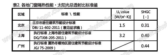 門窗的熱工性能要求不斷的提高,形成了如今的現行標準。對保溫有影響的門窗保溫性能,用“傳熱系數”(K值)表示,各個地區有相關的標準。對制冷有影響的門窗遮陽性能,單窗性能用“太陽光總投射比”(SHGC值)來表示。現在各地實施的標準要求如表2。