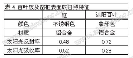 表3表示從條件 0到條件 3的計算對象,即推拉門(A-1)、內平開固定窗組合窗(A-2),外平開門(A-7)的外觀圖和商品特征。條件 0是被比較的基準對象窗。門窗一直在關閉狀態,并且使用一般的中空玻璃。條件1是有通風換氣功能的門窗,對門窗在開啟或使用通風功能的情況下進行評價,門窗即使在關閉的情況下也可以通過通風器來進行通風,與條件一樣使用普通的中空玻璃。條件2是帶有遮陽功能的窗,室外側玻璃(5-A9-5的普通中空玻璃)和室內側玻璃(3毫米的浮法玻璃)當中安裝有可收納的遮陽百葉構造裝置,通過調節百葉來達到遮蔽太陽光的效果,表4表示的是百葉片和框表面的日照特性,百葉片的節角度為45度。條件3是結合條件1的通風換氣功能和條件2的遮陽功能于一體的門窗。