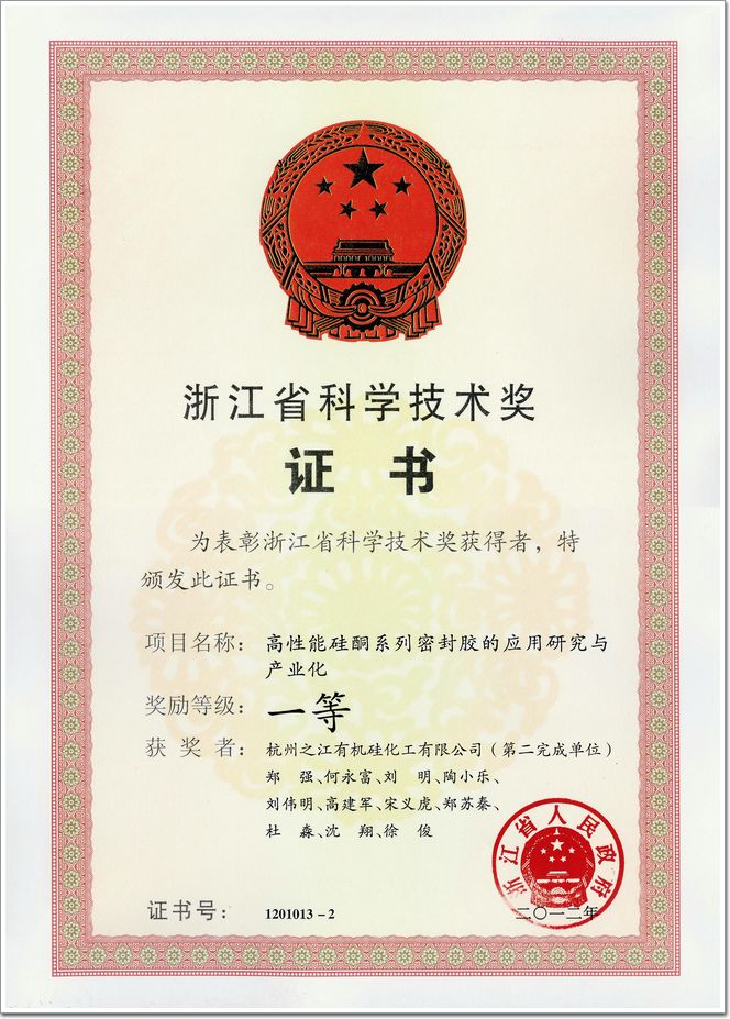 杭州之江有機硅化工有限公司和浙江大學合作的項目在此次全省科學技術獎勵大會上獲得2012年浙江省科學技術獎一等獎。杭州之江