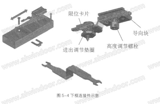 ①導向塊卡入下框型材的槽口中,左右可以自由滑動,以實現水平方向上的調節功能,