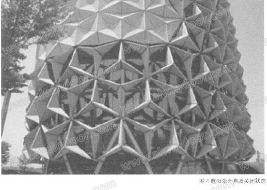 之所以說本工程的遮陽是智能的,是由于其可以完成全自動運(yùn)行。首先,根據(jù)當(dāng)?shù)厝旯庹战y(tǒng)計(jì),編制每天太陽照射各傘的時間列表。再通過調(diào)試程序,給每個傘執(zhí)行指令來完成傘的開啟或關(guān)閉動作。從而實(shí)現(xiàn)對建筑遮陽的調(diào)節(jié)任用;此外,控制系統(tǒng)中加設(shè)了位移傳感器 、風(fēng)雨感應(yīng)器 、光感器等裝置。這些裝置協(xié)調(diào)運(yùn)行,保證Mashrabiya遮陽系統(tǒng)1.一般情況下,Mashrabiya將會按照任意給定的太陽方位和高度自動運(yùn)行;2.每個Mashrabiya可以獨(dú)立運(yùn)行。3.可以在降雨速度達(dá)到1小時25mm時運(yùn)行。在降雨等級超過該強(qiáng)度時自動關(guān)閉;4.在長時間的烏云遮蓋情況自動關(guān)閉;5.通過人機(jī)界面,可以同步實(shí)時觀測每個傘的運(yùn)行狀態(tài)(圖5)。當(dāng)某個傘出現(xiàn)故障時,會立即發(fā)送信號給控制面板,提醒故障類型及故障傘編號、位置;
