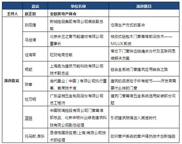 此次活動由全聯房地產商會常務副秘書長趙正挺先生主持,出席的嘉賓有中國建筑金屬(詞條“金屬”由行業大百科提供)結構協會原會長姚兵先生、中國建筑金屬結構協會秘書長劉哲先生、中國建筑金屬結構協會副會長張俊乾先生、中國建筑金屬結構協會副會長、北京米蘭之窗節能建材有限公司董事長馬俊清先生、中國建筑金屬結構協會副會長、廣東堅朗五金制品股份有限公司總裁白寶鯤先生、上海市工商聯房地產商會配套產業分會秘書長宋新昌先生、上海市建筑五金門窗行業協會秘書長錢經緯先生、新城控股集團有限公司高級副總裁歐陽捷先生、當代置業(中國)有限公司執行董事、首席技術官陳音先生、中國建筑金屬結構協會聯絡部主任孟繁軍先生、全聯房地產商會寫字樓分會秘書長劉凱先生、中國房地產部品采購聯盟副秘書長馬學明先生等。