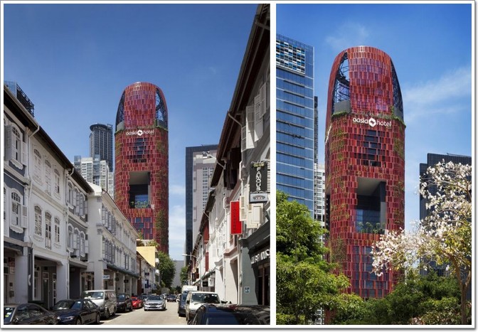 新加坡是一個美麗而干凈的島國,“花園城市”的美稱不是浪得虛名。凡是到過新加坡的人,無不對這個城市國家優美的環境、盛開的鮮花、綠色的草坪、清新的空氣所吸引。綠洲酒店由WOHA所設計,位于新加坡高密度的中央商務區(CBD(詞條“CBD”由行業大百科提供))核心地段,是熱帶城市的土地利用集約化的典型,在林立的高樓中,這幢27層的紅色酒店外觀十分顯眼,頂部的圓形設計,也增加了整體的開放性。
