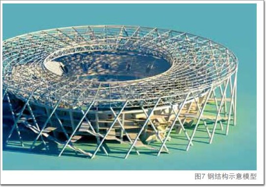 建筑鋼結(jié)構(gòu)(詞條“建筑鋼結(jié)構(gòu)”由行業(yè)大百科提供)設(shè)計全部以“開啟屋蓋”為核心,通過重復(fù)兩個圓形軌道得到屋面鋼結(jié)構(gòu)的上下弦連接桿件系統(tǒng),并采取類似邏輯將鋼柱體系進行分解,得到內(nèi)外兩套傾斜鋼柱系統(tǒng),用螺旋上升的桁架進行連接,最終形成整體外部的鋼結(jié)構(gòu)系統(tǒng)(圖7)。