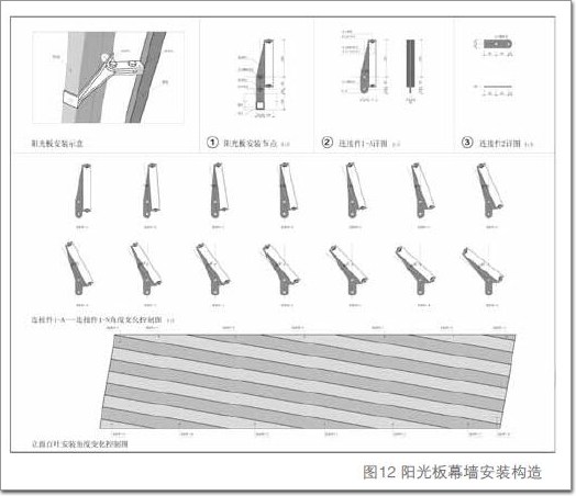 由于立面上的各層陽光板從設(shè)計效果上要求被扭轉(zhuǎn)成不同的角度,因此設(shè)計了14種不同角度的連接件。施工人員無需關(guān)注到底需要將幕墻單元扭轉(zhuǎn)多少,他們只需按照立面圖紙所示的分區(qū),將不同的連接件安裝至檁條上,然后將每一塊幕墻單元與連接件連接即可達到設(shè)計要求(圖12)。