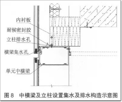 一般情況下,結構梁前面會增加內襯板作為外觀裝飾或輔助防水、隔熱材料。內襯板與外立面的面板之間在室內外存在溫差或外立面面板未注膠的情況下,很容易出現有水滴下或滴入的情況。因此,單元式幕墻系統應在結構梁下部的橫梁上部設置集水及排水功能。通常,該單元中橫梁是在內襯板前面設置弧形集水孔,而兩端的單元立柱在該橫梁集水孔范圍內也應設置排水孔(圖8),以將集水孔的水排到單元立柱外腔,從而實現水外泄。