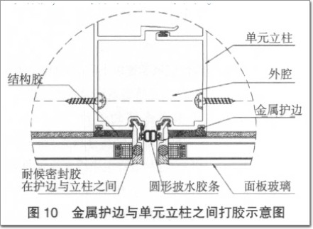 由于金屬護邊處于室外,即使護邊有披水膠條,雨水還是容易進入板塊的外腔。如金屬護邊與單元立柱之間的縫隙未注耐候密封膠,則進入內腔的雨水就會通過該縫隙進入內部的空隙,以至進入室內。因此,單元板塊組裝完成后,應在板塊側邊的金屬護邊與立柱之間的縫隙注密封膠(圖10),以滿足防水功能,且也考慮結構膠的耐候性。