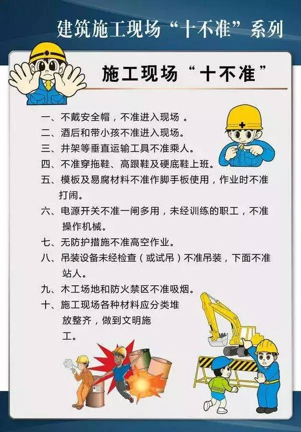 建筑施工安全是我們建筑施工行業(yè)的基石,是施工企業(yè)各項工作的前提。企業(yè)員工應(yīng)牢固樹立“安全第一,預(yù)防為主,綜合治理”的思想。擺正各種關(guān)系,真正做到人人講安全,時時講安全,事事講安全,杜絕一切違章現(xiàn)象,對企業(yè)安全生產(chǎn)起到積極的促進作用。以下施工現(xiàn)場“十不準”,讓你做一個真正安全的建筑人。