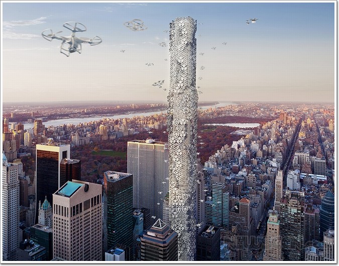 前不久,在《eVolo雜志》的建筑設計比賽中,一座命名為“蜂巢”的摩天大樓在比賽中獲得了第二名,大樓坐落于曼哈頓中心,是一座專為無人機提供對接和充電的中央控制終端,這個為個人和商業(yè)無人機創(chuàng)建的基礎設施項目,可以使無人機融入到紐約的生活中。