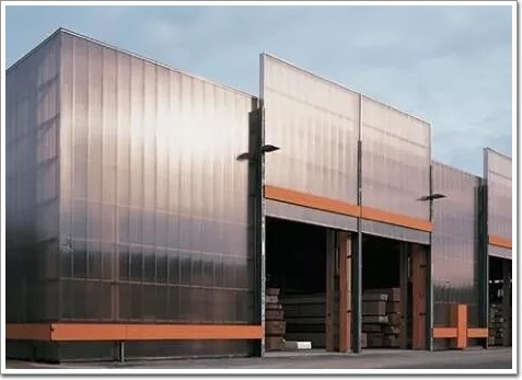 塑料板材易于加工、價格便宜、樣式繁多,被大量應用于建筑表皮。材料生產商以塑料為原材料生產出豐富的板材產品,如蜂窩板夾心板(詞條“夾心板”由行業大百科提供)復合板等,可供建筑師自由選擇。弗洛里安·納格勒(Florian Nagler)設計的德國博賓根(Bobingen)考夫曼霍茲公司貨物儲運中心(圖7),采用半透明聚碳酸酯(詞條“聚碳酸酯”由行業大百科提供)(PC)空心板外墻,立面完整統一,采光良好,與周圍環境緊密相連。其使用的聚碳酸酯空心板重量輕、結構硬度強,創造出良好的視覺效果。