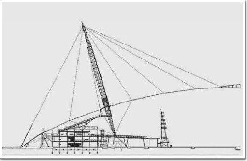張拉膜建筑又稱索膜結構建筑,是通過鋼骨架支承或鋼索張拉使膜成型的建筑。理查德·羅杰斯(Richard Rogers)于2000年設計的千年穹頂(Millennium Dome)(圖13)采用了張拉膜結構,由玻纖織物基層及白色PTFE涂層復合膜制成,具有良好的耐候性保溫性。穹頂直徑365m,中心高度50m,由超過70km的鋼索(總用量)懸吊在12根100m高的鋼桅桿上(圖14)。