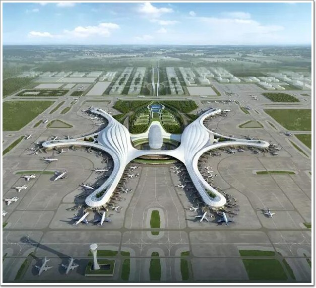 天府機場航站樓設計靈感來自于具有鮮明古蜀文化特色的金沙“太陽神鳥”,總體規劃的4座單元式航站樓猶如馱日飛翔的神鳥,象征著天府機場以獨有的自信、高昂的姿態面向世界騰飛。此外,航站樓創新采用“手拉手”的方式進行連接,較好地結合了單元式航站樓和集中式航站樓的優點,該種構型為國內首次采用。