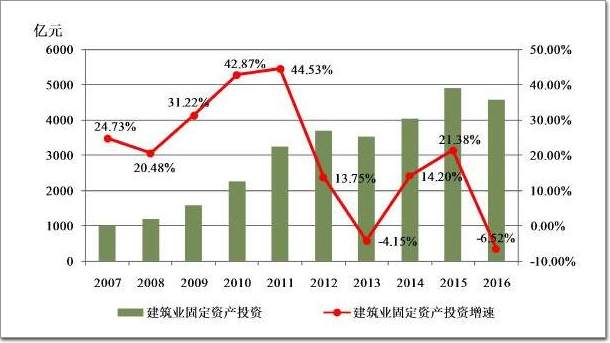 2016年全社會固定資產投資(不含農戶)比上年增長8.1%,增速已是連續5年下降,而建筑業固定資產投資增速更是出現大幅震蕩,由上年增長(21.38%)變為負增長(-6.52%)。在全社會調結構、轉方式的大背景下,說大投資時代已然過去似乎也并無不可,事實上,建筑業這么大的體量,投資所能帶來的增長效應會越來越微弱,很多企業也加大了在建筑工業化、技術創新等方面的投入,轉型升級勢在必行。