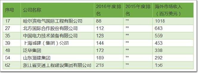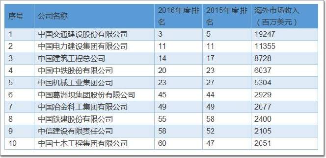 從我國企業對外承包工程的競爭力來看,根據ENR公布的2016年度“全球最大250家國際承包商”排名,我國內地共有65家企業入選,數量與上年持平,其中27家企業排名有所提升,新進榜企業7家。中國交建連續9年排名中國上榜企業首位,而且名次從上年的第5 位上升到第3 位。