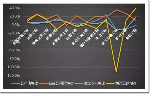 從利潤總額來看,通信工程和公路工程的增長率遙遙領先,分別增長了40%和24%,同時遠遠超出其營業收入的增長速度,可見這兩個領域今年在成本控制上表現突出,鐵路工程在營業收入大幅增長的情況下,利潤總額卻下降了11%,增速比去年降低36個百分點,利潤空間明顯受到擠壓(詞條“擠壓”由行業大百科提供),化工石油工程在去年出現4%左右的降幅后繼續大幅下降,2016年負增長111%,出現了6.8億元的巨大虧損,該類別企業承受的壓力可見一斑。