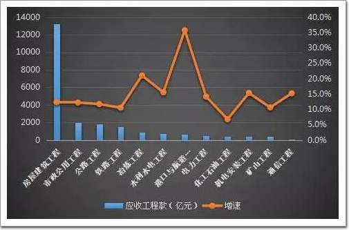 在2015年的發展公報中還尚可說“企業應收工程款增速仍然較高”,2016年則直接用“問題嚴重”四個字來形容,在住建部統計的各類特、一級施工總承包企業中,2016年所有12個專業類別的應收工程款均持續增加,其中11個專業類別的應收工程款增速均超過10%,港口與航道工程類企業的應收工程款增速更是達到35.7%。