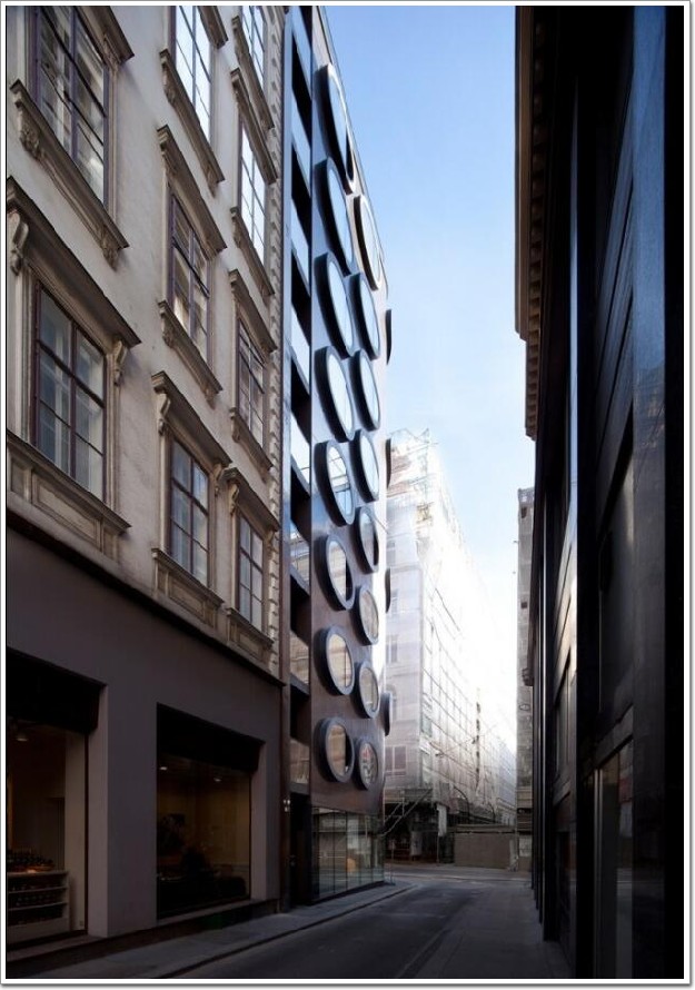 這個名叫Topazza的酒店位于維也納市中心的歷史地帶,由BWM Architekten事務所設計,酒店周圍都是一些極具歷史意義的建筑,歷史氛圍濃厚。Topazz是該地區首座綠色節能型的酒店。先進的節能技術和低運營成本、綠色建材以及內部設計等都體現出可持續性的特點。之所以是“斑點”,是因為飯店的立面點綴著大型的橢圓形窗戶,它們的間隔是不固定的,以便與周圍房屋不同的高度對等,這不僅使自然光線很好的照射到室內空間,減少白天能源的消耗,同時也賦予了該酒店獨特的風格,使其從周圍的建筑中脫穎而出。