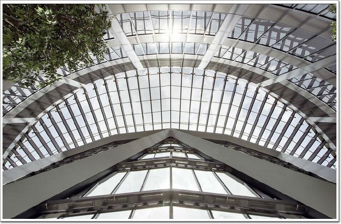 建筑整體外立面采用深藍(lán)色玻璃幕墻,銀灰色米字形外筐架,整個大廈成弧形,更擴(kuò)大了采光面,看起來端莊別致,自有一種氣勢,引人注目。在建筑向內(nèi)凹一側(cè)的立面上,玻璃幕墻被向外拉拽,形成一系列中庭,縱貫整個建筑。這些空間作為氣候緩衝區(qū),對建筑起到絕熱作用,有助于大幅度降低建筑能耗。鑒于各樓層的面積都以滿足一個完整的業(yè)務(wù)單元的需要而確定,有必要加強公司間的協(xié)作,為辦公空間營造出一個社交維度。