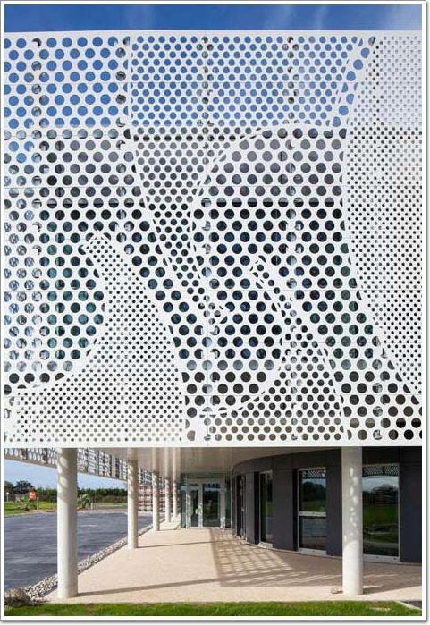 中國(guó)幕墻網(wǎng)ALwindoor.com認(rèn)為穿孔鋁板以完整統(tǒng)一的材料語(yǔ)言覆蓋建筑表皮,可以增強(qiáng)公共建筑的整體性和純粹性,形成簡(jiǎn)潔、明確、肯定的外部形象,創(chuàng)造感官直接強(qiáng)烈的感染力。在建筑中,穿孔鋁板表皮可遮擋建筑界面不規(guī)則的開(kāi)窗,統(tǒng)一建筑語(yǔ)言,與其他材料共同構(gòu)成均質(zhì)的立面,豐富表皮的肌理與層次。