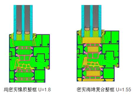 如圖5所示,在型材、玻璃、隔熱條等條件相同情況下,我們用熱工軟件對EPDM實心膠條、復合膠條的進行了對比分析,分析結果表明,使用復合型等壓膠條,最高可以將整窗的U值降低0.25左右。