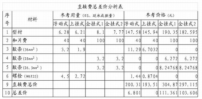 1.本表僅考慮每平米直接費的差價,且未計插芯、托板、角片和翻窗(詞條“窗”由行業大百科提供)費用。