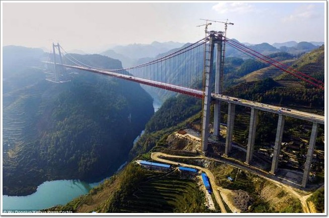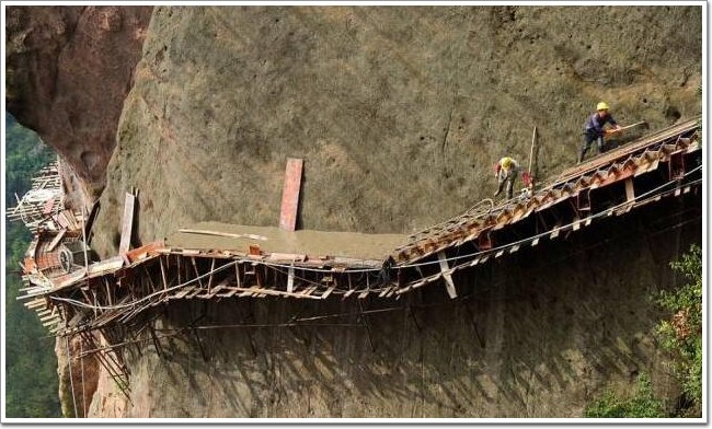 工人們背著沉重的木板,推著滿載混泥土的推車,穿過搭建在幾千英尺(1英尺=0.3048米)空中的木板路運輸修路所需的材料。