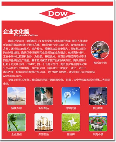我們再來看看“企業文化篇”。其中介紹了陶氏強大的技術力量和創新能力,為全球175個國家和地區的客戶提供種類繁多的高科技產品和解決方案。在34個國家和地區運營189個生產基地,產品系列達7000多種。陶氏通過材料、聚合物化學和生物科學,來推動創新和創造價值,全力解決當今世界的諸多重大挑戰。