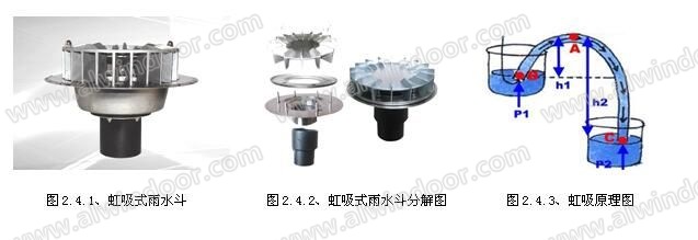 在CECS183:2005 《虹吸式屋面雨水排水系統(tǒng)技術(shù)規(guī)程》術(shù)語中規(guī)定,虹吸式屋面雨水排水系統(tǒng):按虹吸滿管壓力流原理設(shè)計,管道內(nèi)雨水的流速壓力等可有效控制和平衡的屋面雨水排水系統(tǒng)。一般由虹吸式雨水斗(如圖2.4.1~2.)、管材(連接管、懸吊管、立管、排出管)、管件、固定件組成。