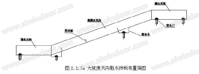 2.2.3、大坡度的排水天溝應(yīng)設(shè)置阻水擋板、水平落水斗: