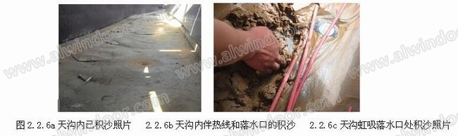 大部分屋面的天溝和檐溝都是裸露在外的,對于室外的粉塵、風(fēng)沙和風(fēng)中的夾雜物隨著雨水或自重會進入到天溝內(nèi)。特別是在風(fēng)沙大的地區(qū)這個問題就顯得十分嚴重,就連有蓋板的天溝都會被積沙、積塵侵入,如不能及時清理積沙會將全部排水口封住,特別是對虹式排水口的功能破壞非常嚴重。(如圖2.2.6a、b、c)