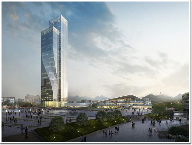 該項目外形極具辨識度,大扭擰角度的幕墻可以在第一時間抓住所有人的視線,建筑形體上的非線性(詞條“非線性”由行業大百科提供)與線性曲線相互交織,柔化立面輪廓,鋼筋水泥間直線與曲線咬合錯疊,玻璃幕墻隨之彎轉變化,以堅硬的建筑材質表現了柔韌的弧度之美。而項目面對廣場這一寬闊的開放空間,讓該建筑具備成為標志性塔樓的有利條件。
