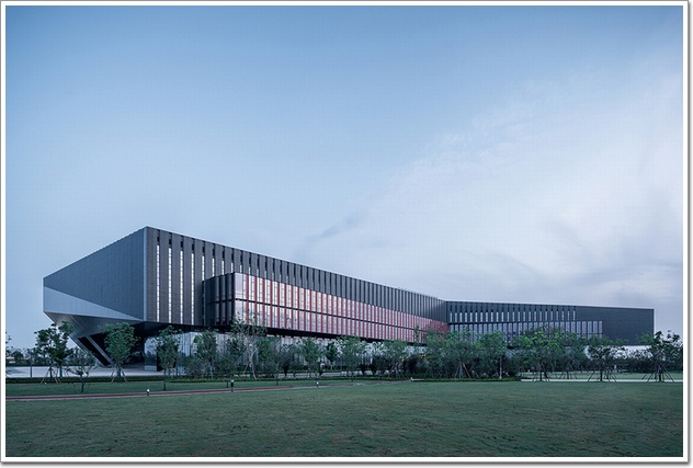 在外立面方面,線型建筑通過三次轉折完成了平面塑造,立面幕墻主機理也是連續折線,這想法來自風吹動湯遜湖水產生的褶皺紋。面湖的兩個方向是利用柱陣和全玻璃幕墻打開視線,有些學院風格。南邊主入口是削切和架空的硬質“黑色盔甲”,東面是三色疊加的扁平帶狀,南和東面都很硬,有面對城市的清晰姿態,并不總是“友好的微笑”。