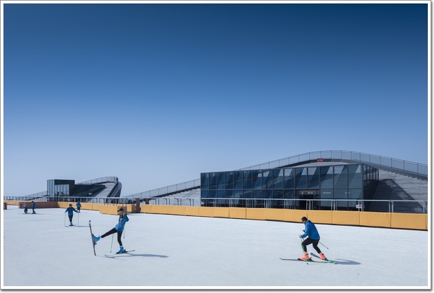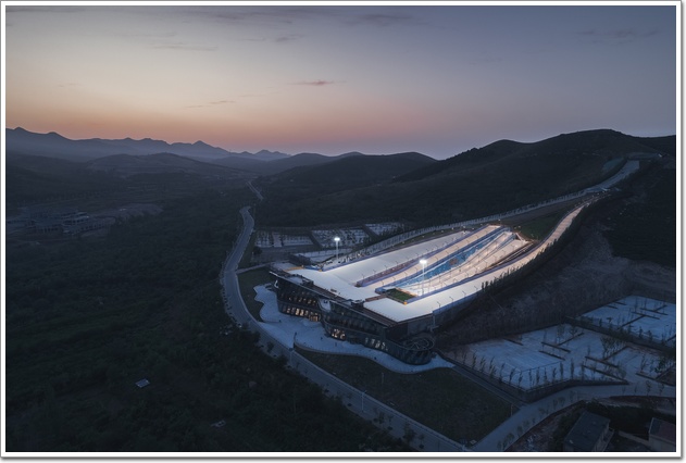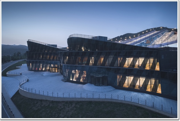建筑體的形態順應山體展開,仿佛山風吹過起了些許褶皺。南側在水平展開的波峰位置分別對應室內大空間,而波谷位置則成為納入人流的入口或水平交通空間。二三層形態的皺褶之處自然的形成了供游人休憩的露天陽臺,薄薄的貼服在外傾的幕墻一側。頂部的形態與雪場視線相對,順勢展開成兩座看臺,休息的游客仿佛坐在微微的土坡之上以最佳視角觀看著一個個滑雪的身影。