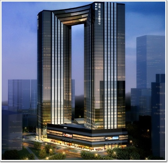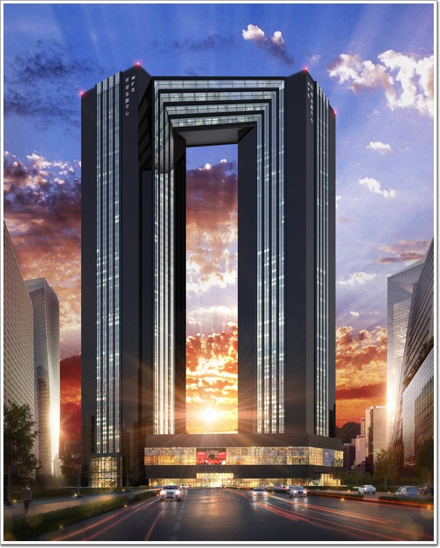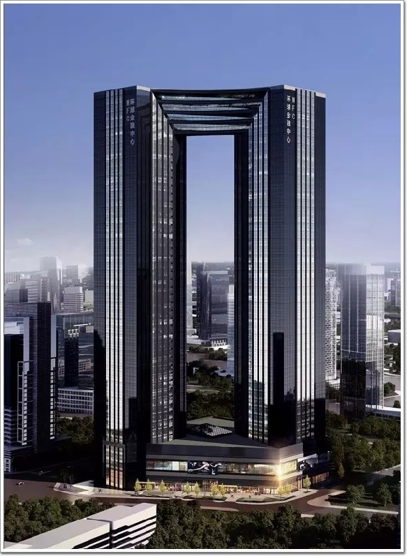 領地環球金融中心位于天府新城核心區,規劃設計由美國思納史密斯設計公司擔綱,項目整體以“黑鉆凱旋門”為造型,由兩棟206米超甲級寫字樓構成,法國凱旋門以其威武雄壯的外在形象意味著勝利,炫耀著軍功,而“凱旋門”形象第一次來到中國西部,該項目則用其形,領其神,在此基礎上,打造出44~47層空中連廊,這也是整座大廈最具特色的部分之一。