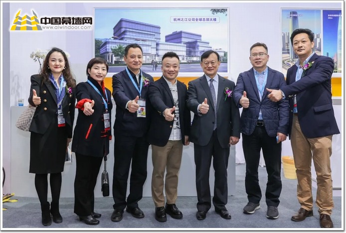 中國建筑金屬結(jié)構(gòu)協(xié)會鋁門窗幕墻分會會長董紅(右三)、龍湖集團(tuán)幕墻高級總監(jiān)鄭平(右二)、廣州城博建科展覽有限公司總經(jīng)理謝荔輝(右一)一行