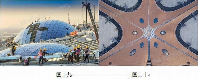 北京大興機(jī)場(chǎng)航站樓采光頂包含了8個(gè)特殊的鋁結(jié)構(gòu)采光頂,每個(gè)采光頂外觀呈氣泡狀,建設(shè)者們簡(jiǎn)稱它們?yōu)椤皻馀荽啊薄馀荽安晒忭數(shù)奶厥庵幵谟冢慕Y(jié)構(gòu)體系全部為鋁合金結(jié)構(gòu),大到工字鋁結(jié)構(gòu),小到鋁合金副框。鋁結(jié)構(gòu)采光頂系統(tǒng)由工字型6082-T6鋁合金構(gòu)件(詞條“構(gòu)件”由行業(yè)大百科提供)、6082-T6鋁合金曲面節(jié)點(diǎn)圓盤和虎克螺栓組成,在鋁結(jié)構(gòu)的上方,是解決采光頂防水、遮陽(yáng)、節(jié)能等功能的構(gòu)造系統(tǒng),該系統(tǒng)由鋁合金附屬型材、鋁合金限位塊、鋁合金壓塊、緊固螺栓等構(gòu)件組成。(見(jiàn)圖十二)