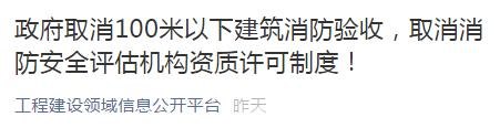 正是因為這則條目,很多自媒體便大肆傳播,宣布已取消了100米以下建筑消防驗收,行業內很多人也轉發表示欣喜。