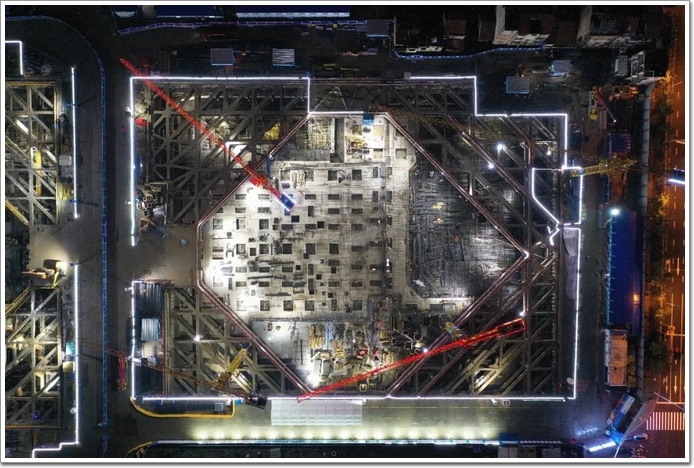 A1地塊自10月19日全部進場后,日夜奮戰,燈火通明,大干15天完成10臺塔吊安裝及首道內撐全部完工,于12月19日,提前2個月完成3層角撐約3600噸鋼筋綁扎、約24000m³混凝土澆筑。