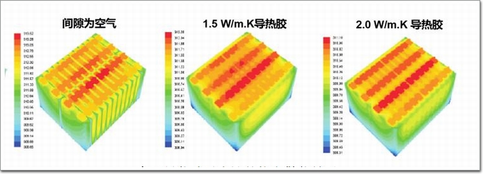 熱管理系統按冷卻介質可分為風冷、液冷、相變冷卻、熱管冷卻等。當下動力電池行業占據“C”位的當屬液冷模式。而在液冷模式下,導熱膠則具有重要的輔助作用。有科研機構建立了單體電芯發熱模型,仿真分析了不同放電倍率下電池模組的發熱情況,研究對比了不同導熱系數的導熱膠對于鋰電池的均衡散熱效果。研究結果表明:導熱系數越高的導熱膠對降低電池的溫升和溫差越明顯,電池溫度分布也越均衡(如圖1所示)。由于動力電池電芯的最佳工作溫度帶很窄(20-40℃),導熱膠的熱量傳導使得電芯溫度和電芯間的溫差下降1-2℃對于電池熱管理系統帶來的幫助是非常顯著的。