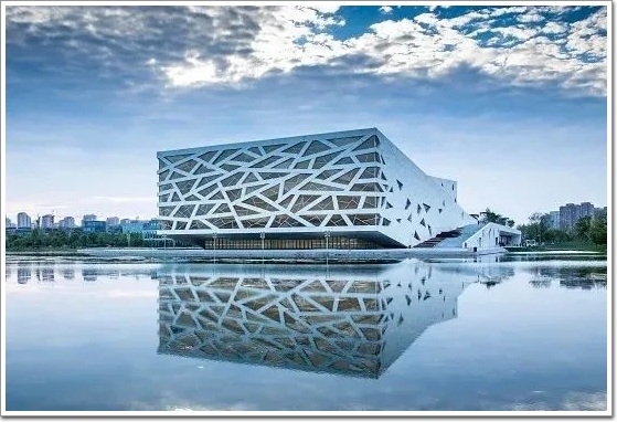浙江余杭文化藝術中心項目可謂是:高顏值、有氣質、更時尚!獨特的冰裂紋效果和傾斜造型,打造了一個絕美的地標建筑,不論是白天在陽光照射下的折射還是夜晚燈光的點綴,堪稱幕墻工程中的藝術品。同時,浙江余杭文化藝術中心穿水而建,水面倒影使建筑一部分看起來似乎沉浸在水面下,真正演繹出“堤岸高筑”之美。
