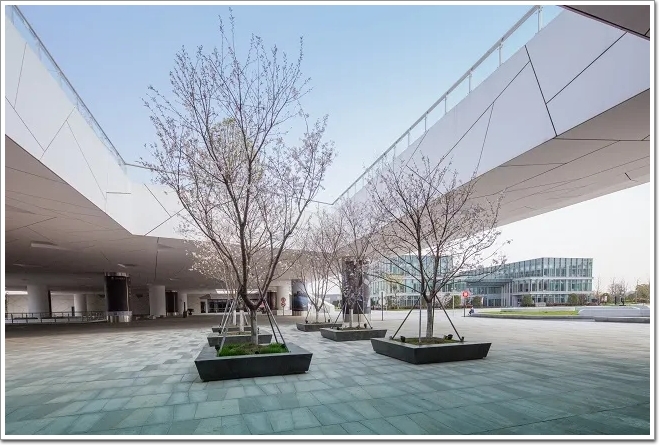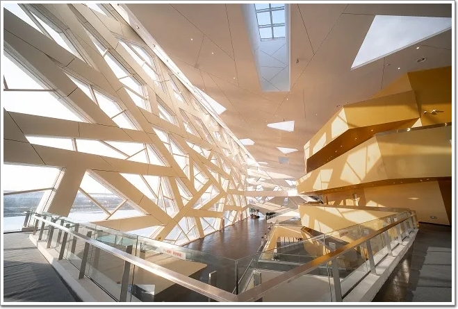 外立面設計靈感源自中國圖案冰裂紋立面,提取自中國剪紙和余杭滾燈元素,結合白色不規則外墻幕墻系統,立面干凈純潔,室內與室外具有密切的互動空間關系;正立面俯瞰湖面、公園,使其成為大型露天劇場的一部分。