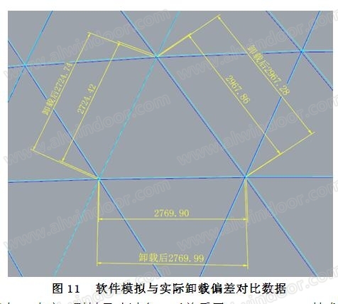 使用結構計算軟件對各種工況下的鋼結構進行模擬,將各種工況的模型進行對比分析,發現主體鋼結構節點雖然會發生大小不同和方向各異的位移,但整個鋼結構是連續變形的,鋼結構中心區域的相鄰支座的相對位移和轉動并不大,玻璃的邊長和內角也變化不大,因此中心區域的玻璃和支座可按理論下單,僅邊緣局部位置根據實際測量下單加工,大大縮短了下單時間。