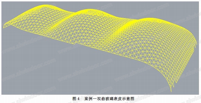 雙曲玻璃表皮采用六片交匯三角形網格劃分,每個三角形玻璃內角各不相同,且相鄰兩片三角形玻璃空間夾角各不相同。玻璃邊線在主體鋼結構的垂直投影線,基本與鋼結構桿件中心線重合。玻璃邊線交點到六棱柱表面的垂直投影點與六棱柱中心重合,同一條玻璃邊線兩端交點到主體六棱柱的垂線不平行。其中,案例一采用中空雙夾膠Low-E玻璃、玻璃邊長2.7m左右;案例二采用夾膠鍍膜玻璃、玻璃邊長2.1m左右。