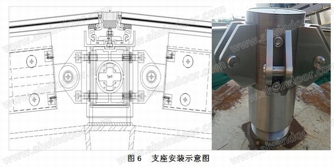 通過橫梁兩端設置兩種不同的插芯:其中一端是可固定鋁(詞條“鋁”由行業大百科提供)插芯,插芯的的另一頭連接在支座耳板的銷軸上;另外一端的插芯由兩部組成,一個是可旋轉插芯,同樣用兩顆螺栓穿過橫梁固定,一個是可固定插芯,一頭連接在支座耳板的銷軸上,另一頭插進可旋轉插芯中間,利用可旋轉插芯實現鋼結構和采光頂玻璃幕墻龍骨的轉動和伸縮。