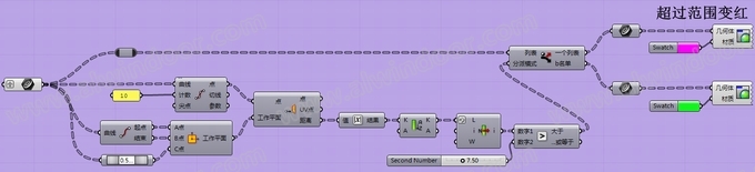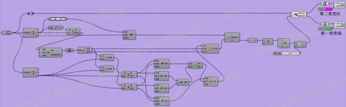 我們根據上述原則,在不改變建筑外形效果的前提下,通微調幕墻曲率重新建立幕墻面板模型,如果整體模型里的單塊鋁板能達到上述兩種要求,就可以將鋁板分別加工成平板和單曲板運至現場,鋁板安裝時順著幕墻骨架壓彎成型,實現整體幕墻雙曲造型。順著這個思路,整體面板模型順利完成,導入編制的Grasshopper電池組檢測(見下圖11),如果達到上述第一類的面板會變成預設的綠色,達到上述第二類的面板會變成預設的紅色(見下圖12)。