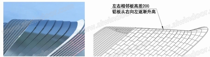 穿孔鋁板橫縫為錯縫設置,豎向分格為兩塊鋁板一組螺旋向上,當鋁板達一定標高后鋁板曲率便隨著標高的增高而增大,同時組與組之間的鋁板高差縫隙逐漸掀開加大至200后再逐漸縮小,鋁板旋至向屋面平轉處時鋁板縫隙縮小至縫合(見下圖5)。