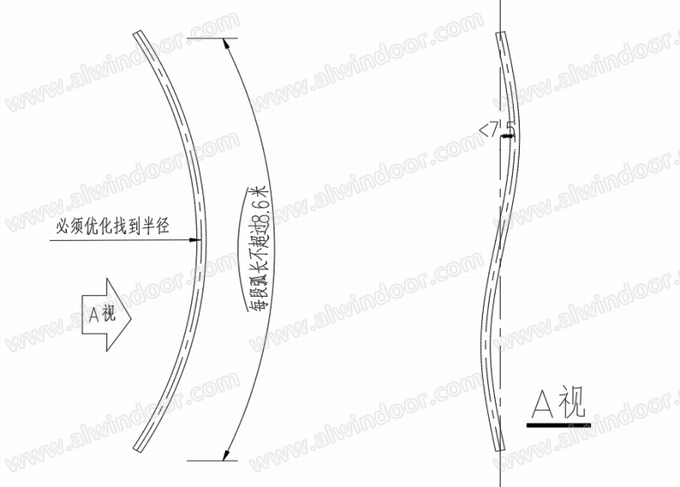 我們在進行新模型建立時,雙曲面幕墻內部骨架緊跟著建立,保證內部骨架要有標準半徑,同時平面外扭曲高差不大于7.5mm(見下圖6),7.5mm的扭曲高差考慮通過優化幕墻節點消化,如達到上述要求,就將雙曲幕墻骨架加工成標準二維圓弧。