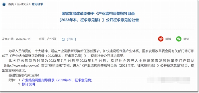 國(guó)家發(fā)展改革委會(huì)同有關(guān)部門(mén)修訂形成了《產(chǎn)業(yè)結(jié)構(gòu)調(diào)整指導(dǎo)目錄(2023年本,征求意見(jiàn)稿)》,現(xiàn)正向社會(huì)公開(kāi)征求意見(jiàn)。此次征求意見(jiàn)的時(shí)間為2023年7月14日至2023年8月14日。