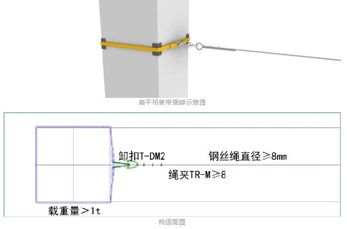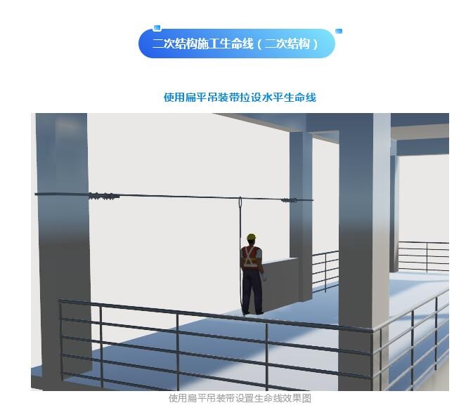 將扁平吊裝(詞條“吊裝”由行業(yè)大百科提供)帶牢固捆綁于框架柱,通過(guò)扁平吊帶末端環(huán)眼拉設(shè)鋼絲繩形成水平生命線。